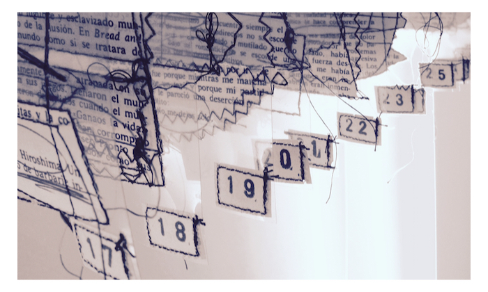 PROJECT "UnderLying" 2016 MANUFACTURING Sewing machine on paper REITERATED ACTION 51/51 MATERIALS yarn, paper, plastic |